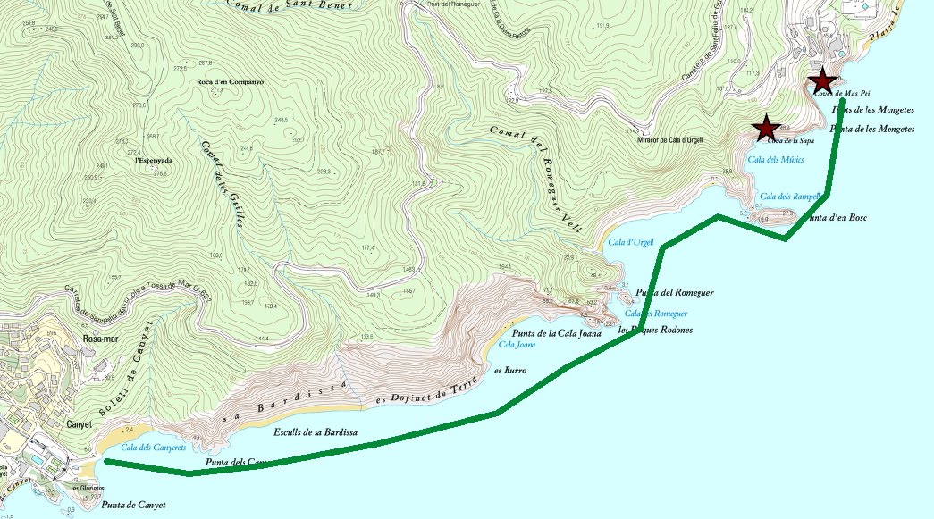 Visitem les coves de Mas Pei i de la Sapa sortin de la platja dels Canyerets (entre Tossa i Sant Feliu de Guíxols) per un total de uns 5 km de recorregut (anada i tornada)